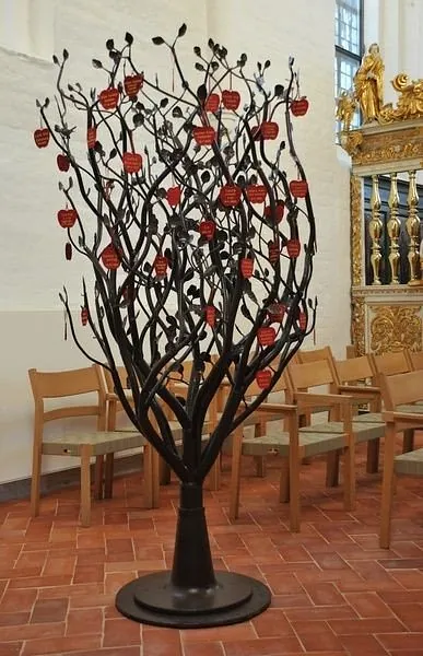 Træet står ved indgangen for at minde os om, at dåben er indgangen til livet som kristen og til det forhold, vi har til Gud som vores himmelske far – og minde os om, at det kristne fællesskab, menigheden består af alle døbte, uanset hvor forskellige vi er – og for at vi kan glæde os over, at der hele tiden kommer nye til det kristne fællesskab.